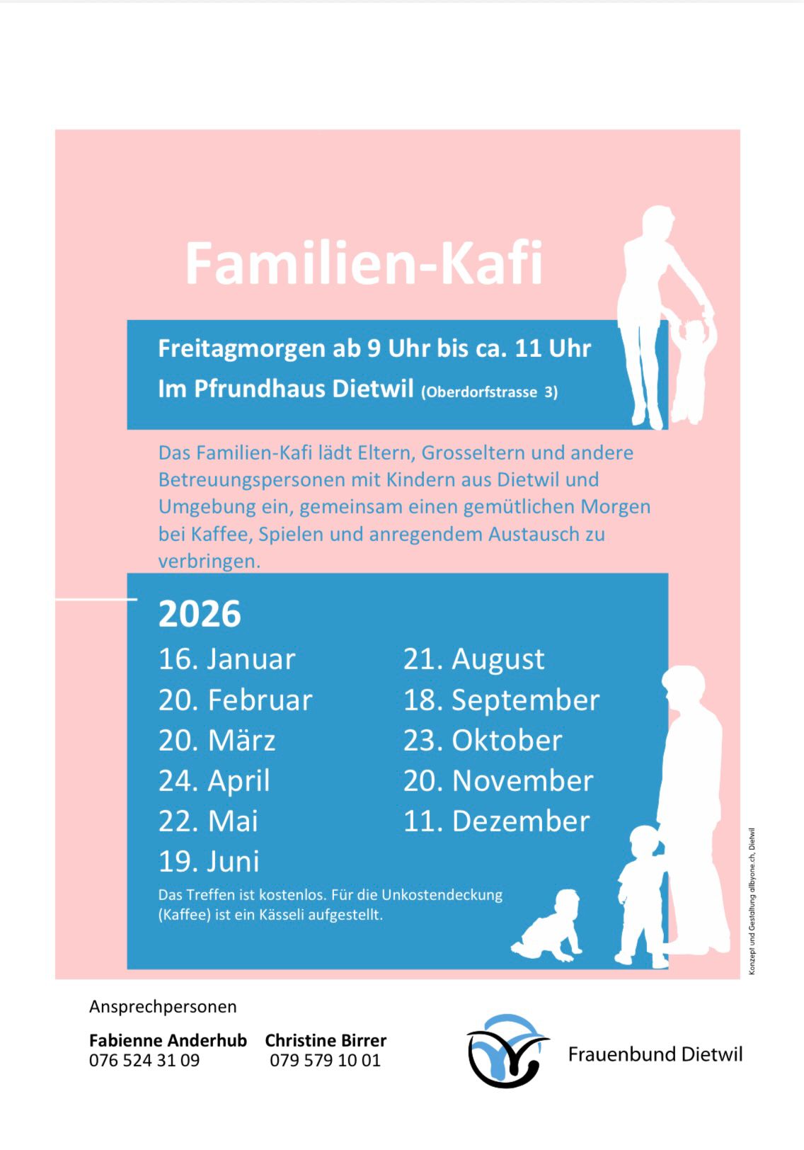 Das Familien-Kafi lädt Eltern, Grosseltern und andere Betreuungspersonen mit Kindern aus Dietwil und Umgebung ein, gemeinsam einen gemütlichen Morgen bei Kaffee, Spielen und anregendem Austausch zu verbringen.